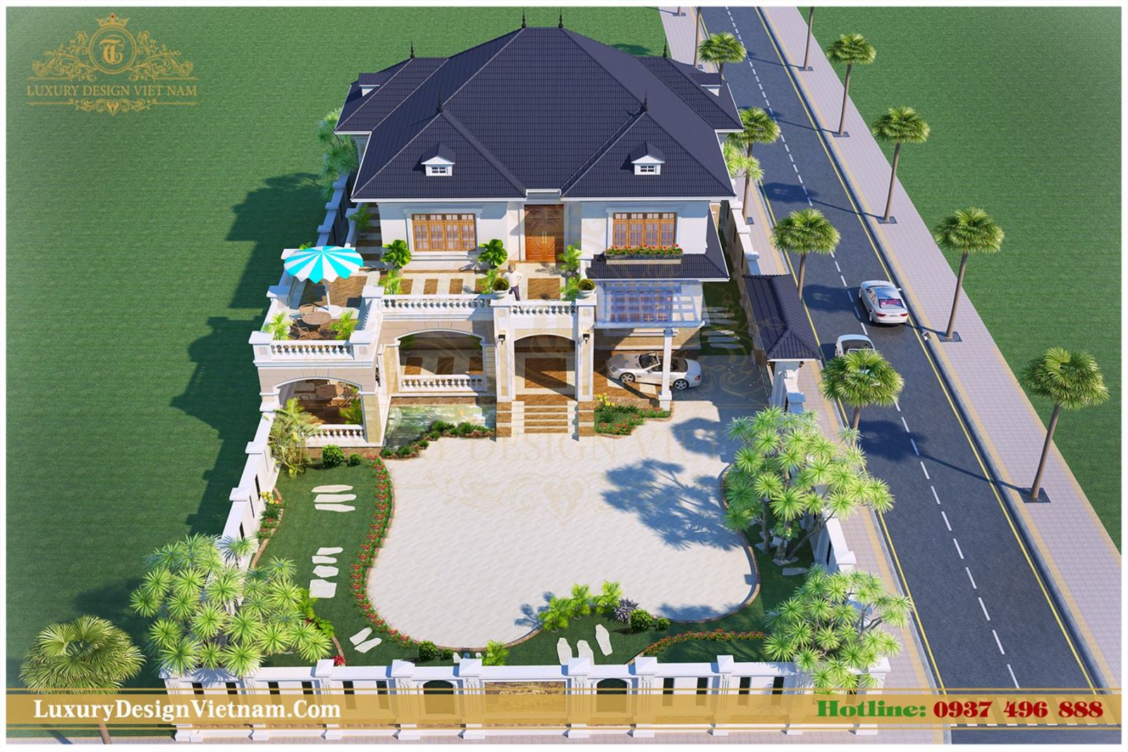 Với diện tích đất sử dụng lên đến 550m2 sân vườn rộng, cộng với vị trí địa lý 2 mặt tiền thoáng nên phương án phối cảnh được thực hiện nhanh.